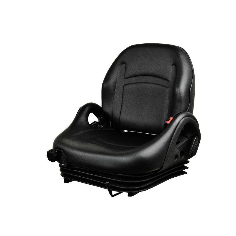 Fotel ma naprawdę bogate wyposażenie. Dobrze wyprofilowane siedzisko i boczki zapewnią wygodę i komfort. Dobrej klasy amortyzacja spełni swoją rolę, w nawet najbardziej ekstremalnych warunkach. Jej dużą zaletą jest małe pokrętło pozwalające dostosować twardość amortyzowania. Na dodatek operator znajdzie w tym egzemplarzu pas bezpieczeństwa. Z kolei oparcie posiada jednopłaszczyznową regulację o dużym zakresie wychyleń. Na jego pleckach znajduje się pojemny schowek zamykany przyciskiem, a w nim druga dodatkowa kieszeń na kilka drobiazgów lub niewielkich kluczy.