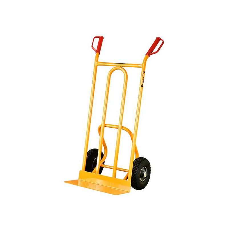 Wózek magazynowy o uniwersalnym charakterze. Świetnie nadaję się to ręcznego transportu worków, skrzynek lub mebli. Konstrukcja została wykonana ze stali. Wózek jest lekki i poręczny. Metalowe piasty kół są odporne na duże obciążenia. Pneumatyczne opony świetnie spiszą się na płaskich oraz nierównych nawierzchniach. Poręczne, wyprofilowane uchwyty zapewniają swobodną kontrolę podczas transportowania ładunków. Lakierowanie metodą proszkową przekłada się na długą żywotność koloru.